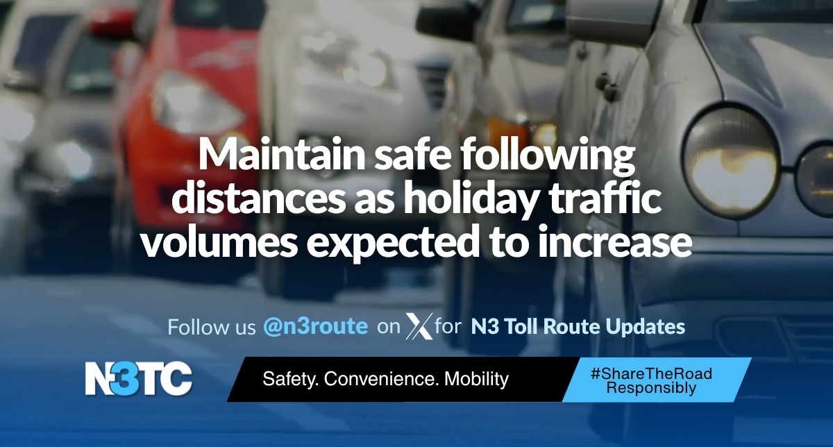 In anticipation of increased traffic volumes on the N3 Toll Route beginning Friday, 27 March, due to school closures for the autumn break and the Easter weekend, N3TC advises motorists to maintain safe following distances, particularly in congested conditions, during wet weather, and at night when visibility is reduced.